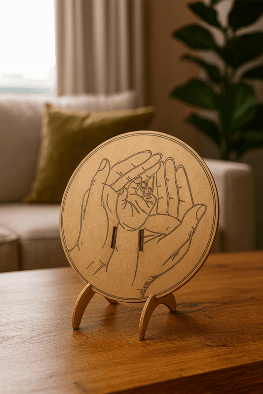 Recuerdo de nacimiento en madera – Manos de madre y bebé con pulsera hospitalaria