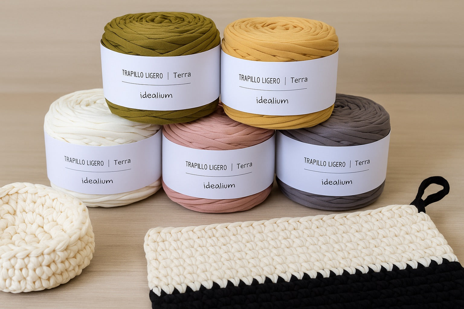 Imagina una cesta decorando tu salón en tonos neutros, un bolso en color mostaza para los días de verano o una alfombra hecha a mano que aporte calidez a cualquier estancia. Con nuestras bobinas de trapillo ligero todo esto es posible: un material versátil, económico y con el que disfrutarás del placer de tejer en grande.
