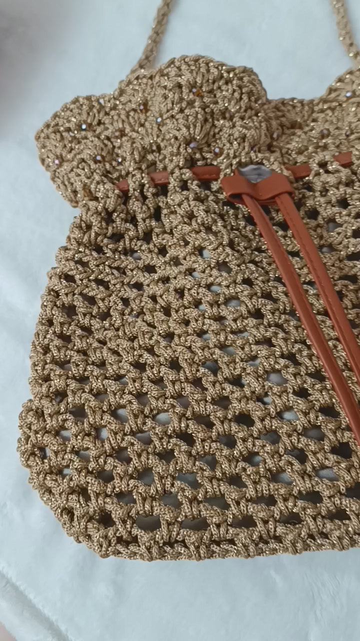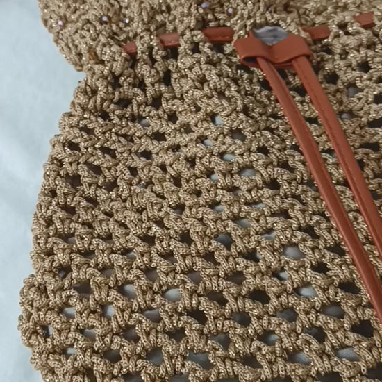 Elaborado con cordón con destellos dorados, forrado y con asa corta de cordón.